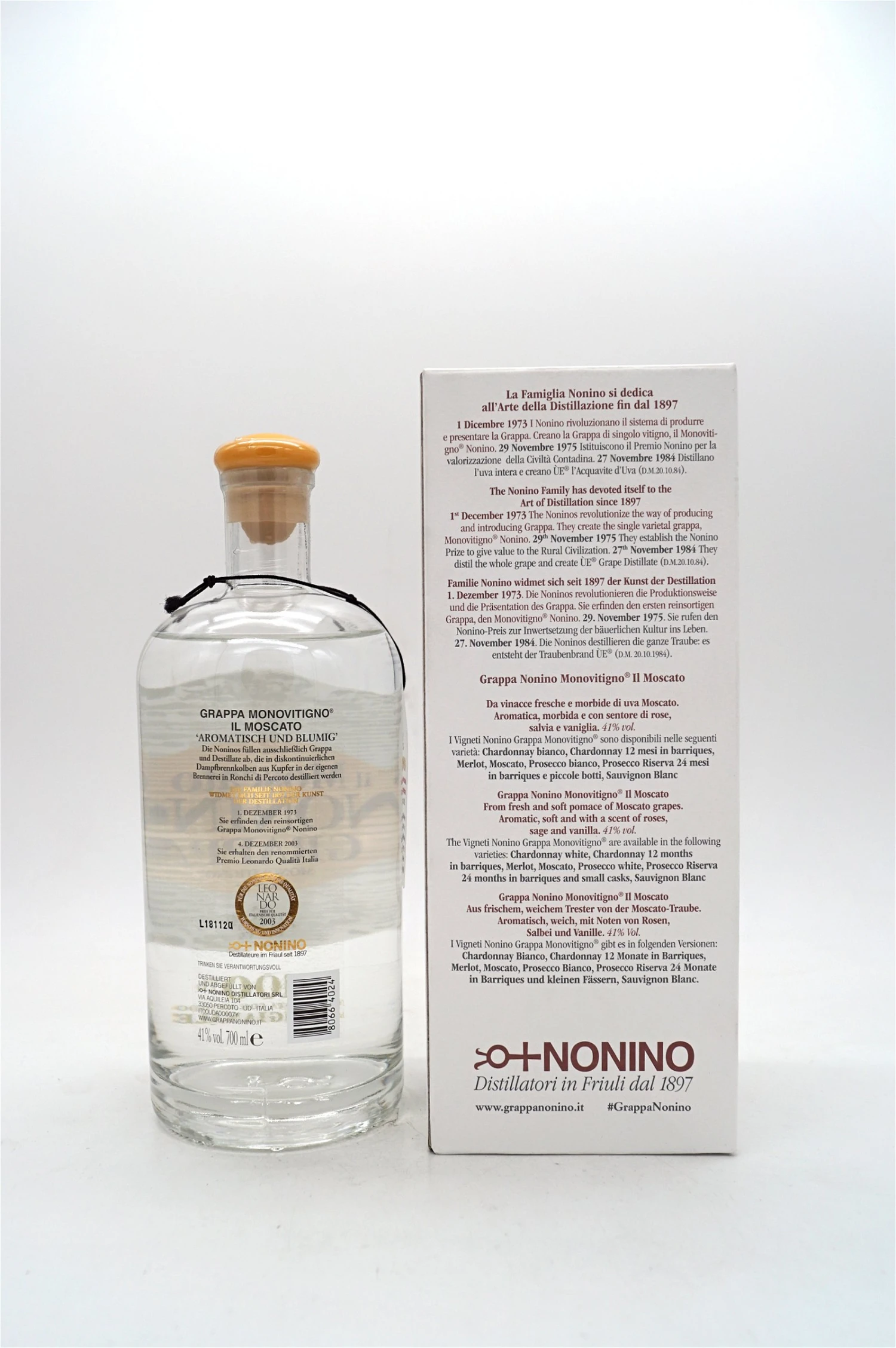Dieser Grappa wird von auserlesenen Trestern der Weinbauregion Friuli erzeugt. Ausgewählte Trester aus Moscato-Trauben, die frisch und weich verarbeitet werden.